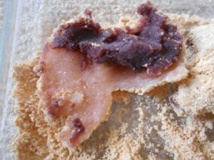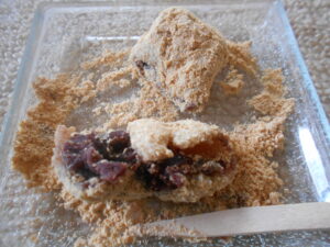 なんとか切り分けることに成功しましたが、餅生地の「切れなさ」はもちろん、力を入れて切ろうとして黄な粉を周りにまき散らしてしまう危険にドキドキしてしまったという。。