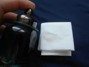 香水の色を確かめるため、ティッシュペーパーに噴射してみます。