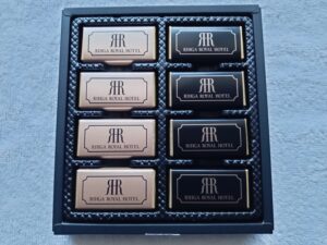 リーガロイヤルホテルのロゴがシンプルに施されていて、ゴールドとブラックの2種類の個包装もこれまたなんともなしにラグジュアリー。