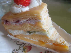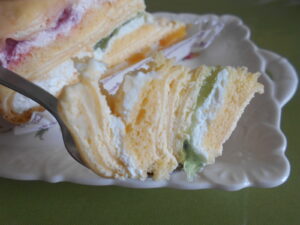 これまで紹介してきたフルーツケーキはスポンジとクリームのベーシックの組み合わせでしたが、今回は卵と小麦粉、ミルクを合わせたクレープ素材になっています。
