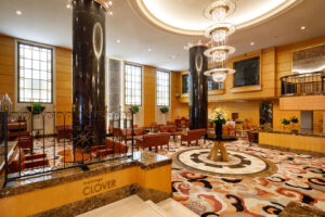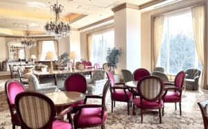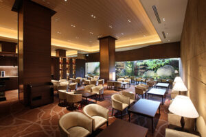 徒歩一分でたどり着くホテル内のラウンジは、ヨーロピアンクラシカルに盛岡情緒を融合させた「繊細で優美な佇まい」と吹き抜けのある明るく開放的な空間。