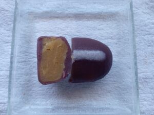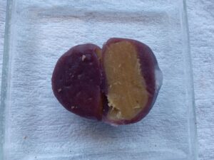 割ってみますと、餡コーティングされた内部にみっちり詰まった黄色い芋を発見。