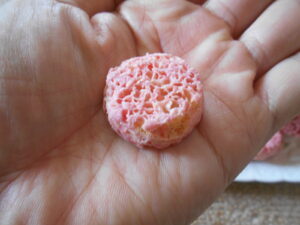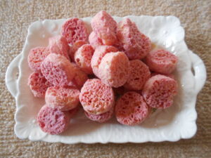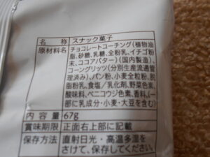 前回のしっとりチョコと同じ「コーンと小麦を混ぜたスナック」に今回は「いちごチョコ」をコーティングしたスタイルということ。
